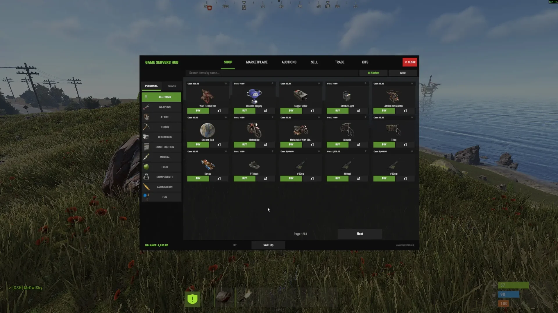 A complete GUI shop system for Rust with categorized item stores, a player-to-player marketplace, live auctions, direct trading, dynamic pricing, NPC vendors, vending machine terminals, and deep analytics — all powered by EconomyCore. Plugin by TheOwlSky | gameservershub.com | Discord